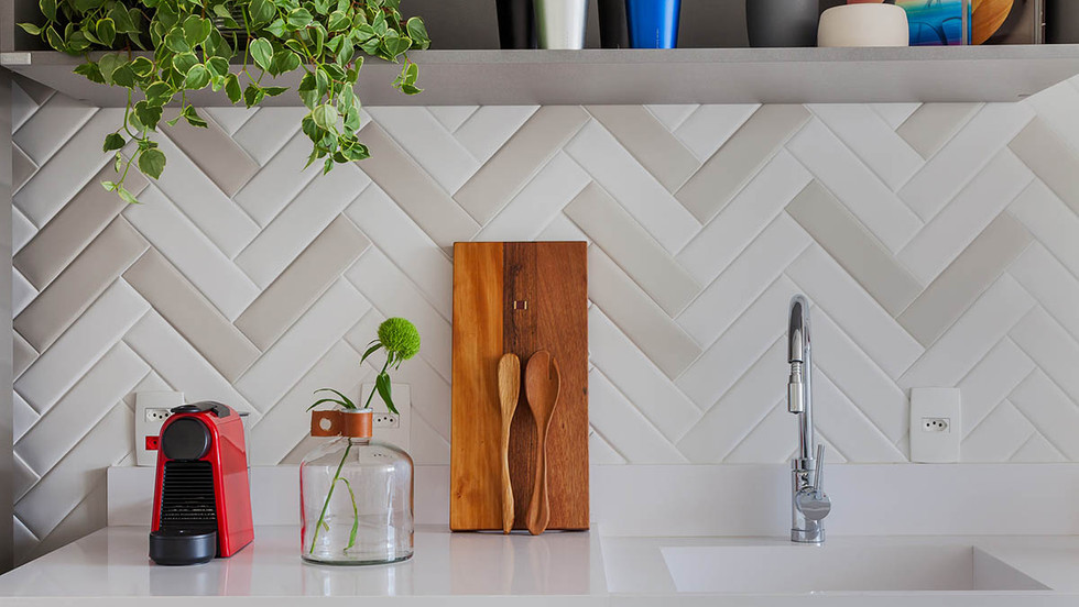 Para conferir praticidade, o porcelanato foi escolhido para a área da cozinha e lavanderia. O revestimento cerâmico utilizado na cozinha e lavanderia foram trazidas para parede lateral da sala de jantar para integrar ainda mais os ambientes.