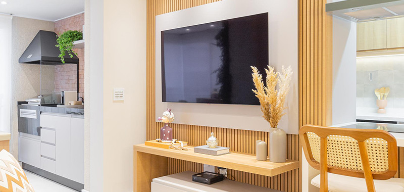Na sala de estar, o projeto de marcenaria foi de painel ripado com armário inferior com portas em cava. Já na sala de jantar, o painel ripado tem nichos com iluminação em LED. A mesa de jantar tem tampo em off white e base de madeira e as cadeiras têm encosto em palinha e banco linear.
