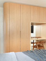 Na decoração, é tudo novo, adquirido de acordo com as especificações do projeto. Entre as peças de design assinado, vale ressaltar as cadeiras de jantar Medalhinha (de Lucas Bond), a mesa lateral Fenda (de Eduardo Bortolai) e as luminárias Bauhaus e Ufo (ambas de Fernando Prado para a Lumini). “Priorizei móveis clean e visualmente leves, ora com estrutura em madeira ora em aço carbono, e estofamentos com tecidos claros, em tons mais naturais. Para quebrar a paleta monocromática, usei uma mesa de jantar oval, totalmente verde, num tom puxando para pistache”, explica o arquiteto David. “Na marcenaria, optei pelo acabamento em carvalho por ser uma madeira também clara, que traz acolhimento”, completa.