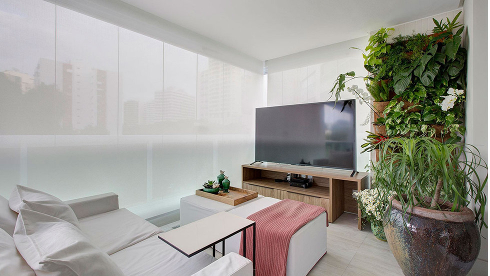 O cantinho para assistir TV ficou na varanda, um ambiente mais casual e informal para receber amigos e família. O casal queria preservar a área gourmet mas não queria um ambiente com aparência de cozinha, por isso, optou-se por uma bancada discreta em granito marrom absoluto, com armários em melamínico amadeirado freijó e paredes revestidas em espelho, dando o efeito que amplia o ambiente.