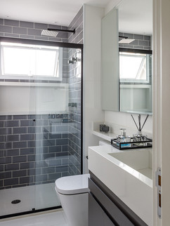 O banheiro do casal apresenta uma atmosfera clean, convidando à tranquilidade ao espaço, mas sem abrir mão da personalidade. A exemplo disso, o branco predomina mesmo com o contraponto da marcenaria cinza. Na área do box, o revestimento dá um toque de ousadia.