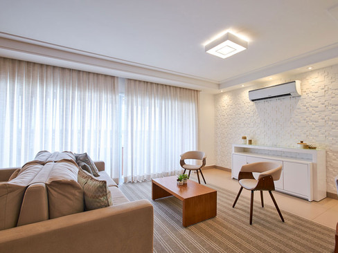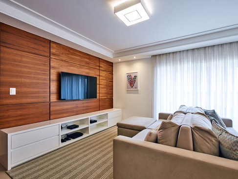 A sala do apartamento possui um grande destaque para o painel em lâmina natural, assim como o escritório instalado em um local que antes não havia uso. A distribuição dos móveis nesse ambiente traz um ar de sofisticação e aconchego. Os armários da cozinha atendem as necessidades da moradora e levam além de sofisticação, um design diferente com a colocação de portas em vidro reflecta.