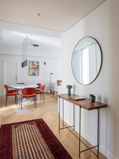 A poucos metros da Basílica da Estrela, o imóvel, de 140 metros quadrados, fica em um dos muitos prédios seculares históricos recentemente renovados na capital portuguesa e tinha ainda muito de suas características originais. Por isso, eles optaram por manter o estilo do local preservando elementos como a boiserie e o piso de madeira com paginação espinha de peixe criando um contraste com as escolhas contemporâneas de decoração como a marcenaria sob medida e o mobiliário.