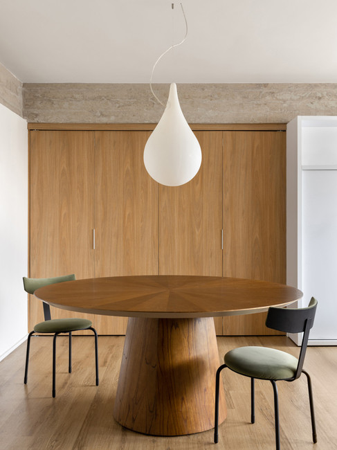 A área comum tem um layout aberto, fazendo a integração das salas de estar, jantar e cozinha. Na cozinha, a marcenaria inteligente tem duas portas brancas de correr, que escondem a cristaleira e a TV, podendo ser abertas ou fechadas conforme o uso. Uma porta camarão em freijó com 4 folhas recuadas em relação à marcenaria da sala de estar que possibilitam integrar a sala de TV.