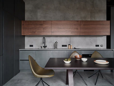 Aplicamos um acabamento incomum na cozinha para que ela não se destacasse do interior brutalista. Confeccionamos as fachadas dos armários e módulos inferiores em MDF com esmalte metalizado fosco. Finalizamos os módulos superiores com folheado de nogueira americana, com uma textura ativa que contrasta bem com o metal. Não estendemos os módulos superiores até o teto para iluminar visualmente a cozinha – eles formam uma faixa estreita. Alongamos a parede na qual se localiza o tampo da mesa e, graças ao novo layout, apenas a parede monolítica do armário coluna é visível da sala de estar, e a grande bancada não é perceptível.