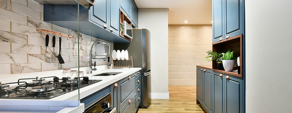 Apartamento Garden traz cozinha azul e visual moderno