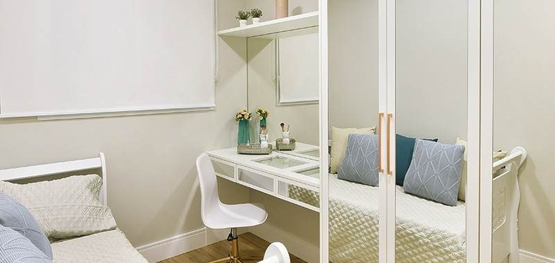 Outro ponto que torna esse projeto especial é a elegância associada a uma série de adaptações para deixar o ambiente funcional para a cliente. “Pensamos em um apartamento aconchegante e prático. Como ela sentiu que sua antiga casa estava muito grande para morar sozinha, quisemos fazer um espaço em que ela se sentisse confortável no dia a dia e também para receber as visitas. Transformamos um dos quartos em closet com cama auxiliar para também ser utilizado pelas visitas. Assim, deixamos o espaço do quarto da moradora bem mais amplo e confortável para receber apenas a cama e o painel da tv”, ressalta Camila.
