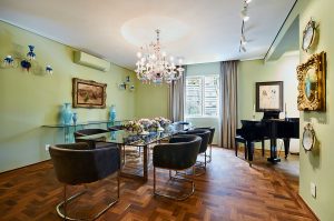 Por se tratar de um imóvel antigo, algumas características foram modificadas para ampliar os espaços e integrá-los. O terraço que antes era aberto foi fechado e ganhou extensas janelas com vista para a Avenida Higienópolis, possibilitando uma bela visão das copas das árvores. Além disso, toda a segurança do apartamento foi reforçada com as portas da MUL-T-LOCK, que acrescentou ao lar soluções de bloqueios de alta segurança com as mais recentes tecnologias.
