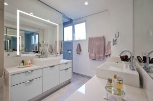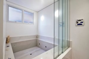 Na área íntima, foram feitos dois pedidos especiais: uma sauna dentro de um banheiro com hidromassagem e espaços amplos para closets individuais.