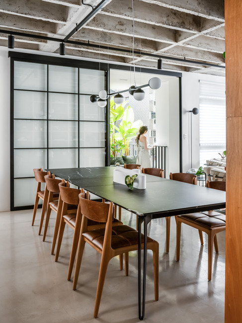 Como em uma boa receita, os ingredientes que compõem o projeto deste apartamento de 220 m² foram escolhidos e fracionados em uma sábia alquimia. Nem menos, nem mais. Para isso, a atmosfera industrial existente desde a primeira reforma – executada, em 2012, pela Brasil Arquitetura – se harmoniza com o mobiliário de designers brasileiros. “Optamos por móveis com linhas leves, para equilibrar o estilo brutalista presente”, diz a arquiteta Mona Singal, do escritório Rua 141 Arquitetura.