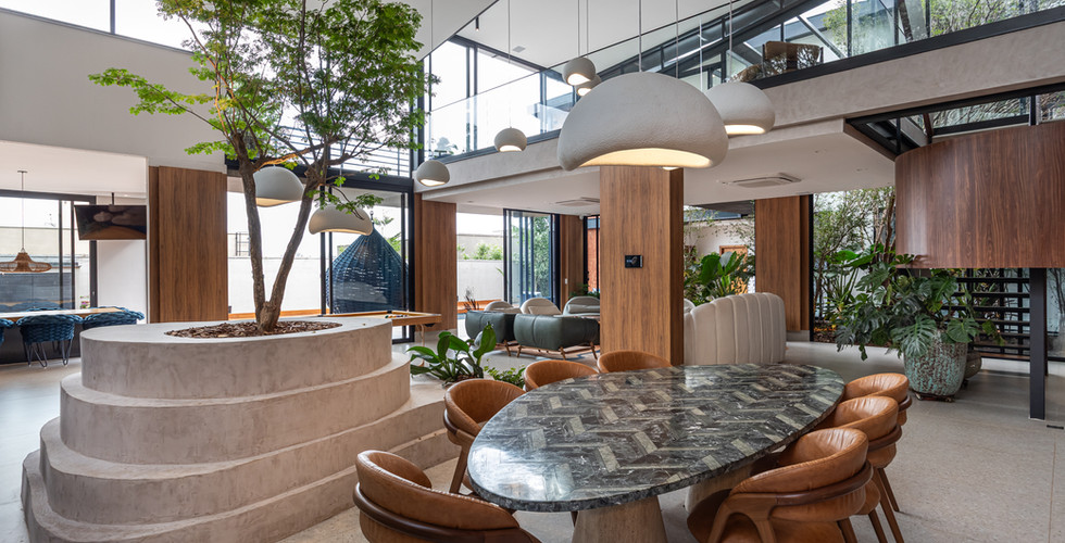 Logo na entrada, a porta em madeira maciça de inspiração oriental já antecipa o conceito de acolhimento. O muro de tijolos terrosos é valorizado com jardins verticais iluminados, enquanto o coração da residência se revela em uma praça central com paisagismo em camadas orgânicas. Esse espaço conecta sala de jantar, gourmet e jogos, funcionando como núcleo de convivência.