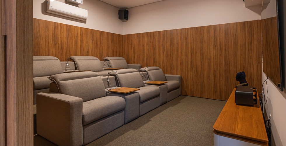 Nas áreas íntimas, a conexão com a natureza permanece central. As suítes do térreo se abrem para bosques de jabuticabeiras centenárias, trazendo frescor e serenidade. No andar superior, a sala de cinema com poltronas retráteis e iluminação cênica oferece experiência imersiva sem sair de casa.