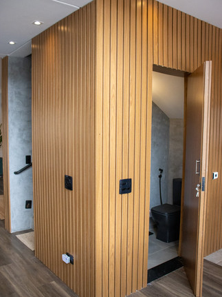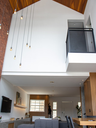 Projetada com um pavimento térreo totalmente integrado, áreas de estar, jantar, lareira, cozinha e gourmet, se fundem em um espaço amplo. Também conta com uma suíte, incluída para atender idosos e pessoas com necessidades especiais, um lavabo e uma pequena lavanderia, camufladas pelos painéis de madeiras ripadas.