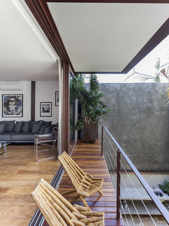 Já o terceiro andar tem duas suítes que se abrem para terraços laterais, roupeiro e uma estante com sapateira que faz as vezes de corrimão. Para facilitar o dia a dia do casal, a área de serviço foi estrategicamente instalada neste pavimento.