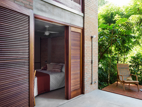 Optou-se pela estrutura convencional de concreto e tijolos maciços na ala mais compartimentada da casa (quartos, cozinha e áreas molhadas), garantindo a expertise da mão de obra local e a carga térmica do material. A qualidade térmica dos ambientes se dá pelo tijolo maciço, telhas termoacústicas e pela ventilação garantida no desenho dos caixilhos e venezianas. As fachadas se compõem em vidro, com proteções de tela atuando como brise e venezianas em madeira, também desenvolvidas com o material e mão de obra local.