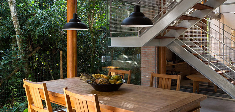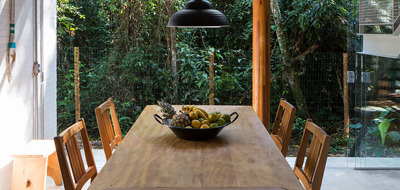 Na praia do Prumirim, com vistas para os mares de Ubatuba, o abrigo de veraneio traz o verde da mata Atlântica para o seu interior