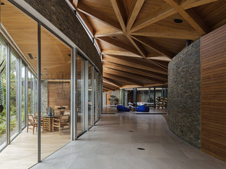 Toda a estrutura de madeira laminada colada com dupla curvatura, que forma a cobertura da varanda e suítes, foi fabricada digitalmente na França, assim como os pilares de aço que a sustentam. As esquadrias de vidro e a cobertura em cobre clipado foram executadas na Espanha, e as placas e mantas necessárias para a perfeita estanqueidade e isolamento térmico do conjunto vieram dos Estados Unidos. Além disso, para evitar ser invadido pelo mar na eventualidade de um furacão, o terreno foi levantado e compactado 2 m, em caliche, em relação ao nível original.