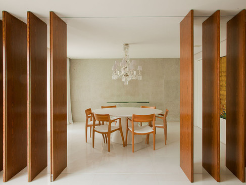 Entre as principais resoluções arquitetônicas do projeto para o Apartamento Jazz, estão os painéis de madeira deslizantes e pivotantes, onde consegue-se fazer a integração da sala de jantar com os demais espaços.