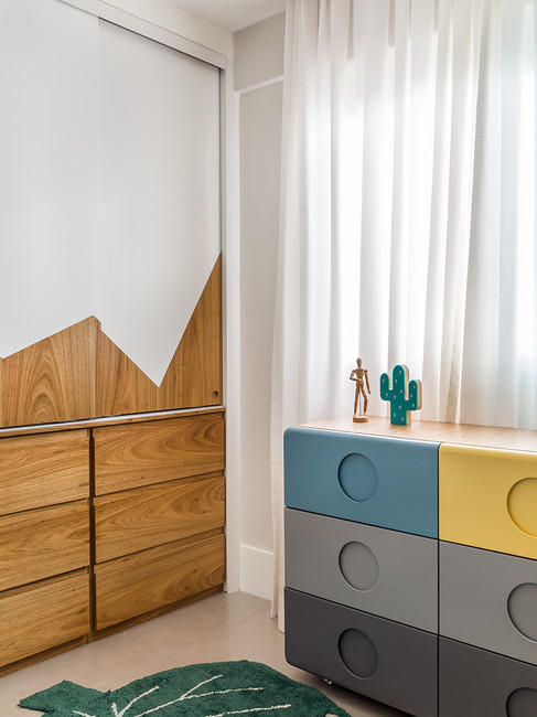 Já no quarto do filho, as arquitetas partiram do papel de parede com desenhos de montanhas que o menino adorava em seu quarto anterior para explorar essa referência no novo projeto, porém agora através do desenho da marcenaria do armário. No décor, elas elegeram as cores favoritas do Eric, azul e amarelo, para criar um ambiente ao mesmo tempo divertido e lúdico. “Apesar de ser um quarto infantil, projetamos um ambiente para acompanhar o menino em várias etapas de sua infância. Atualmente, o quarto funciona bem como um espaço de brincadeira e leitura, mas, futuramente, a tenda poderá ser substituída, por exemplo, por uma mesa de estudo e a cômodo poderá ser laqueada com uma nova cor para tornar o quarto menos infantil. Nosso objetivo foi criar um quarto versátil e de fácil adaptação”, resume Fernanda.