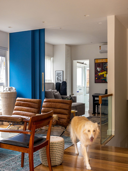 A obra civil foi relativamente pequena, com poucas modificações na planta do imóvel. No segundo andar, por exemplo, um closet (que tinha um lavatório dentro) e uma cozinha vizinha compacta foram eliminados para, no lugar, criar um quarto de música que poderia servir também de quarto de hóspedes, com tv. “Projetamos um painel de correr de três folhas com acabamento em laca azul klein que permite isolar ou integrar este novo espaço e a sala”, informa a arquiteta.
