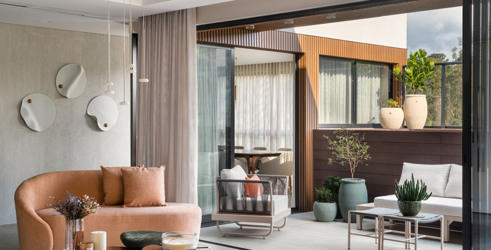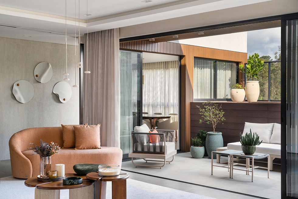 As portas de correr assumem protagonismo ao dissolver fronteiras entre interior e exterior. Quando abertas, incorporam o terraço à área social e ampliam as possibilidades de uso, favorecendo encontros e momentos de convivência. A integração também se constrói nos detalhes: materiais e acabamentos criam uma linguagem visual coesa, reforçando a sensação de unidade em todo o apartamento.