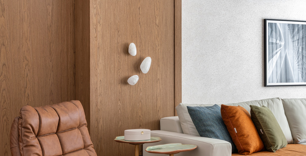 O décor ganha força com peças autorais que funcionam como pontos de interesse e expressão. Na sala de jantar, pendentes em pedra selenita trazem delicadeza e brilho sutil. No lounge, luminárias em rocha criam um gesto escultórico marcante. Já na área da adega, peças em cerâmica reforçam um clima mais intimista, quase cenográfico.