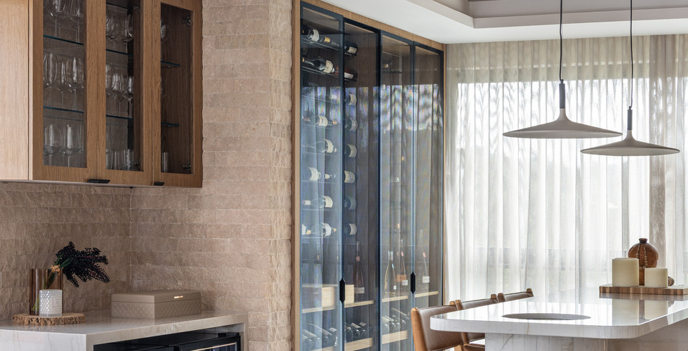 Entre os destaques, o tijolinho de travertino bruto na adega imprime caráter e acolhimento, enquanto o uso de pedras naturais, presente em bancadas e também em superfícies verticais, reforça a identidade do projeto. Mais do que um recurso estético, esses materiais revelam a conexão dos moradores com a natureza e imprimem uma sensação de permanência.
