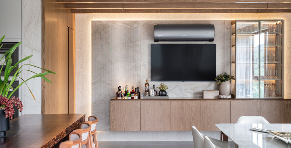 A iluminação, pensada como elemento central do projeto, atua na criação de atmosferas. Em um espaço amplo e setorizado, ela organiza, destaca e acolhe. A base embutida garante conforto visual no dia a dia, enquanto camadas indiretas, especialmente na marcenaria, adicionam profundidade e uma sensação de aconchego que acompanha diferentes momentos da rotina.
