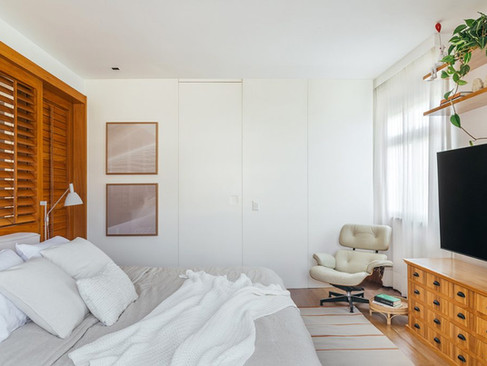 No novo lar, a cliente – que recentemente voltou para a faculdade para estudar psicologia – pediu uma super estante na sala para acomodar os livros de seu antigo apartamento (e eram muitos!) e outros que estavam na biblioteca da casa da mãe, na região serrana do Rio. “A estante foi o ponto de partida para a criação do novo layout no segundo piso. Invertemos a posição da TV, que antes ficava de costas para o terraço, para colocar a vista da área externa no campo de visão de quem está no sofá”, conta a arquiteta Ana Luiza. “Com isso, liberamos a parede principal da sala para instalar uma estante imensa projetada em marcenaria, do piso ao teto, com capacidade para acomodar cerca de 1.500 livros”, acrescenta o sócio Gustavo. Ainda na área social, a cliente pediu uma sala confortável para receber e ver tv, além de uma mesa de jantar de apoio e uma área gourmet, já que a sala de jantar e a cozinha ficam no andar de baixo. Por fim, ela pediu ainda para transformar todo o terceiro andar, que era uma área subutilizada (com escritório, pequeno banheiro e depósito), em uma suíte master para ela, que foi dividida por painéis de correr com venezianas articuláveis – de um lado, ficam o dormitório, dois banheiros e um closet; do outro, a sala íntima com tv, que também pode ser usada como escritório.