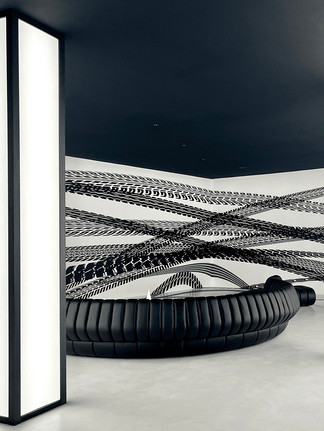 Guilherme Torres, assina a instalação Percursus que explora a correlação entre o trabalho da artista plástica Regina Silveira e do próprio arquiteto. Um grande cubo branco de 158m² oferece suporte para o site specific “Derrapagens”, onde marcas de pneumáticas de distintos veículos recriam a presença do trânsito de uma cidade em constante movimento. Os limites entre corpo e morada são desafiados através de elementos ausentes e perspectivas inusitadas, que são um ponto de convergência no tanto no trabalho de Regina quanto de Guilherme, que cita: “uma casa não deve aconchegar, deve provocar”. (Fotos Evelyn Muller)