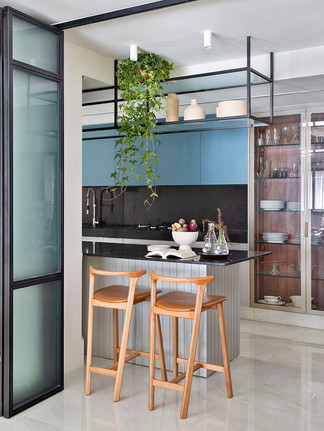 As alterações na planta proposta pela construtora foram feitas pelo próprio casal e só depois o arquiteto João Panaggio foi contratado para projetar as etapas seguintes, incluindo marcenarias, mobiliários e iluminação de todos os cômodos. “Os clientes fizeram vários pedidos. Primeiro, para imprimir a personalidade de cada membro da família em seu respectivo quarto, considerando as preferências de cada um”, conta ele. “Depois, pediram para criar bastante espaços de armazenamento em todo o imóvel, uma adega grande na sala e uma cozinha mais descontraída, de cor azul e com toques do estilo industrial, onde fosse possível não só cozinhar, mas também tomar café da manhã, conversar e receber os amigos”, acrescenta ele. “Por fim, eles pediram uma área social confortável com espaços que estimulassem o convívio em família, fosse vendo TV, almoçando ou preparando churrasco”.