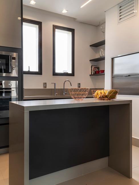 A cozinha, em tons de cinza, conta com uma bancada central em quartzo, que foi selecionada também por seu visual, como também pela resistência para as altas temperaturas tão frequentes na rotina de preparação dos pratos. A área de cocção foi criada na bancada em “L”, que acopla também uma coifa e um espaço para o manuseio de ingredientes. Em um projeto muito bem elaborado, destaca-se o monta-carga, um elevador utilizado para o transporte das refeições, que já integrava a planta original, mas que passou por reformulações em função da reforma.