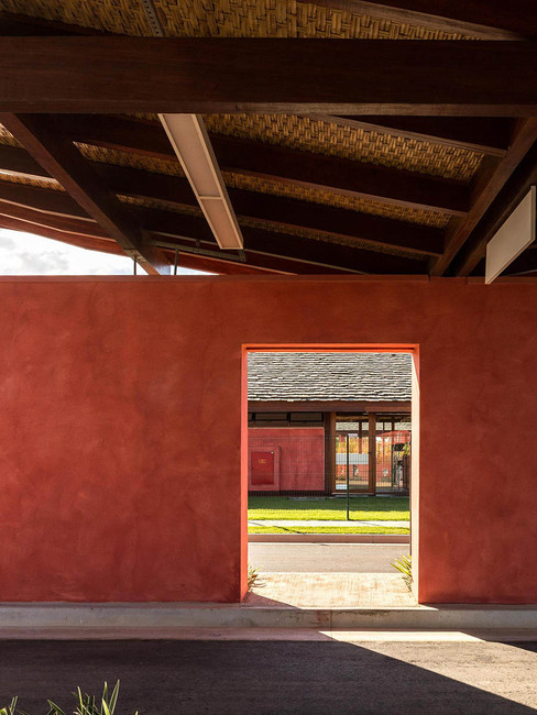 Nos programas mais fechados, como sanitários e áreas técnicas, adota-se o uso de uma massa pigmentada vermelha que reforça a identidade da edificação e se apresenta como mais uma referência às construções tradicionais do Nordeste.