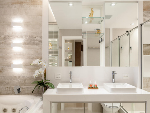 O espaço que era ocupado pela varanda foi transformado em bar com bancada contendo pia, em mármore travertino bruto, marcenaria em laca fendi de forma a abrigar adega e cervejeira e nichos superiores de madeira com porta em espelho bronze, para guardar copos e objetos. Optou-se por balcão de apoio com altura de mesa, forrado em espelho bronze que foi instalado atrás do sofá para maior integração entre os dois ambientes. Para camuflar o acesso ao escritório e a área que compreende cozinha e jantar, foram instaladas portas tipo painel com sistema flowall da Florense.