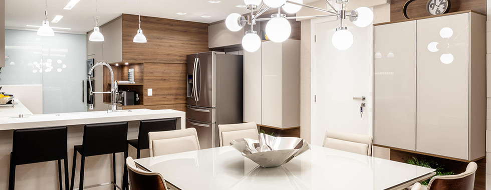 Para atender ao pedido de cozinha integrada com a mesa de jantar e sala de tv, foi demolida a parede da cozinha que fazia divisa com a antiga sala íntima. Criou-se uma área aberta com cozinha e balcão tipo ilha, integrando à mesa de jantar. Porta painel flowall e brise da Florense foram instalados para quando for preciso isolar a área de tv da cozinha integrada.