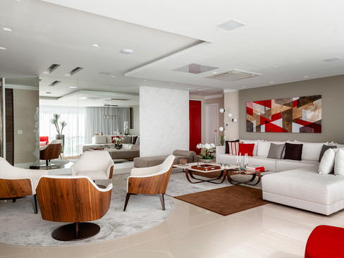 A escolha da paleta de cores da sala de estar, jantar, cozinha e sala íntima e até mesmo do escritório foi definida a partir da escolha dos modulados da cozinha Florense e do padrão madeira usado nas portas painéis do sistema flowall da Florense. O tom do fendi e madeira foi mantido nos demais cômodos de área de convívio, buscando uma integração e interação entre esses espaços, uma vez que eles “conversam” entre si, pois quando as portas dos painéis estão abertas, eles se transformam em um ambiente quase único. O vermelho utilizado no estar, foi escolhido para trazer cor ao ambiente, tornando-o jovial. Uma porta da Cinex vermelha foi instalada na entrada principal e quadros, poltronas e almofadas fizeram a “ponte” necessária para se obter o resultado desejado. O marrom, cinza e o branco também foram usados, acompanhando a paleta de cores utilizada nos mobiliários.