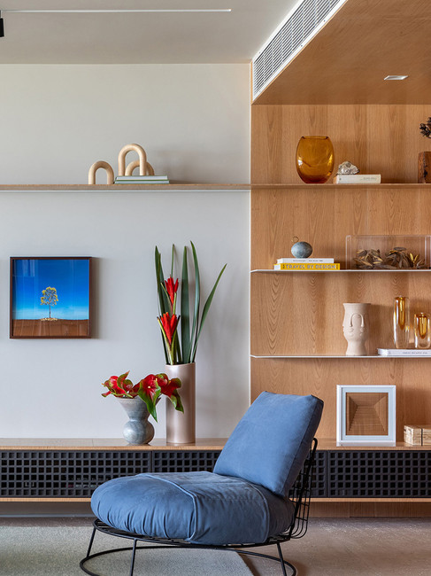 No geral, o projeto buscou criar um lar atemporal e aconchegante para a família, tendo como maior desafio preencher de forma inteligente os espaços amplos e integrados que compõem todos os elementos da área social. Para atender à solicitação por um espaço de coworking, surgiu a ideia de criar uma grande “caixa” camuflada no painel de madeira ripada da sala, com portas que abrem e fecham em sistema camarão, permitindo isolar completamente o espaço e o hall de entrada da sala, quando necessário. Na sala, foi tudo pensado de forma a destacar ainda mais a vista da praia de Ipanema. Para isso, os arquitetos trabalharam com linhas finas e leves e uma paleta de cor com tons beges, terrosos e verdes. O piso de toda a área social, cozinha, sala íntima e circulação, por exemplo, é de travertino navona natural, enquanto no piso dos quartos foi mantido o taco existente. “A paleta de cores foi inspirada em elementos naturais, a exemplo do verde que aparece tanto nas plantas como em parte da marcenaria da cozinha, o tom de areia presente nos mobiliários e no piso, a madeira que reveste a marcenaria, o couro caramelo e o tapete azul que remete ao mar”, avalia o arquiteto Thiago Morsch.