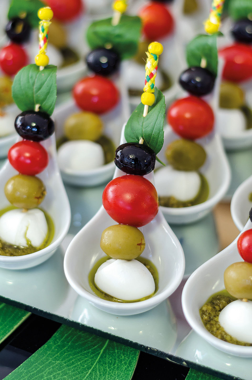 Espetar em cada palito, uma folha de manjericão, uma azeitona preta, um tomatinho, uma azeitona verde e uma muzarela de búfala.