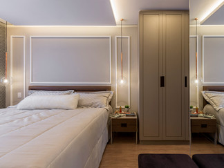 As gavetas do criado-mudo são forradas com o mesmo tecido da cabeceira estofada. Os pendentes iluminam as laterais da cama, conferindo a simetria típica da arquitetura clássica. Uma das solicitações dos clientes era de que fosse inseridas luminárias indiretas, proporcionando conforto visual. Para garantir esse resultado, fizemos alterações no gesso da construtora e instalamos a iluminação no teto do quarto.