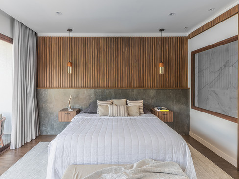 A área íntima está localizada no segundo pavimento, com três suítes e um home office. Do terraço é possível ver a incrível vista de toda a natureza da região. No quarto do casal, o mix de materiais revela um pouco do estilo rústico e bucólico do campo. Sobre o piso vinílico madeirado, foi utilizado um grande tapete de algodão, que ocupa quase o ambiente todo. Em companhia da parede com painel de madeira ripada, a aposta foi por uma cabeceira de porcelanato que imita pedra natural e em pequenas mesas laterais suspensas de madeira. Na suíte, abanheira de hidromassagem separada da área do box, permite que marido e mulher possam usufruir do poder relaxante do banho simultaneamente.