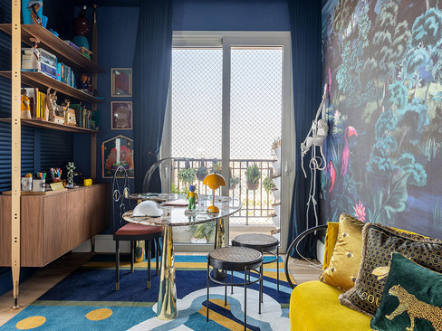 Ousada em suas escolhas estéticas e com grande afinidade com o mundo da arte e do design, a cliente quis preservar um clima de brasilidade no home office, onde funcionava a antiga brinquedoteca. Móveis de design entraram em cena para o dia a dia do home office. Um dos desafios foi equilibrar a vasta seleção de peças de arte e design com a paleta de cores que remetesse ao Brasil: verde, amarelo e azul. Um painel da floresta amazônica em uma das paredes principais do espaço que traz ainda mais essa essência para o ambiente.