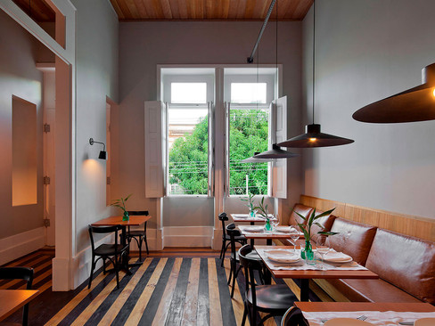 O restaurante ocupa os cômodos do andar superior, onde as esquadrias e piso de madeira originais também foram recuperados.