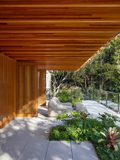 No segundo andar, foi criada uma varanda para os quartos, que funciona como um ambiente contemplativo e dá cobertura para a varanda do piso inferior, com o acréscimo de um acesso externo pela escada helicoidal. Já a área gourmet da piscina foi projetada do zero: “buscamos criar um espaço aberto que valorizasse a vista. Projetamos uma cobertura em estrutura metálica que abriga a churrasqueira, a sauna, o lavabo e um chuveirão. O vidro fixo da sauna faz com que a natureza entre no ambiente e crie ainda mais integração”, explica Victoria.