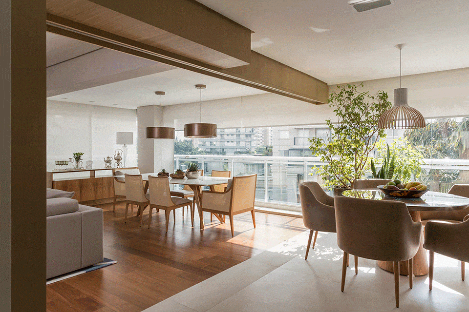 Para oferecer ainda mais interação na hora de receber a família e os amigos, é possível eliminar as barreiras entre os três ambientes – sala de estar, jantar e varanda gourmet – com a solução das portas de correr.