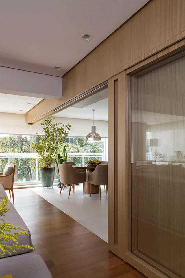 Portas deslizantes multiplicam espaço e integram áreas sociais do imóvel. Soluções de marcenaria engenhosa criada pela arquiteta Ana Yoshida