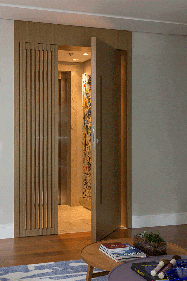 São três lâminas de madeira com desenho personalizado e detalhe ripado, com bastante vidro para não barrar a iluminação natural. Essa solução, além de criativa, tem uma estética muito elegante, pois as portas se transformam num imponente painel, que fecha os ambientes quando necessário, sem impedir a passagem de luz.