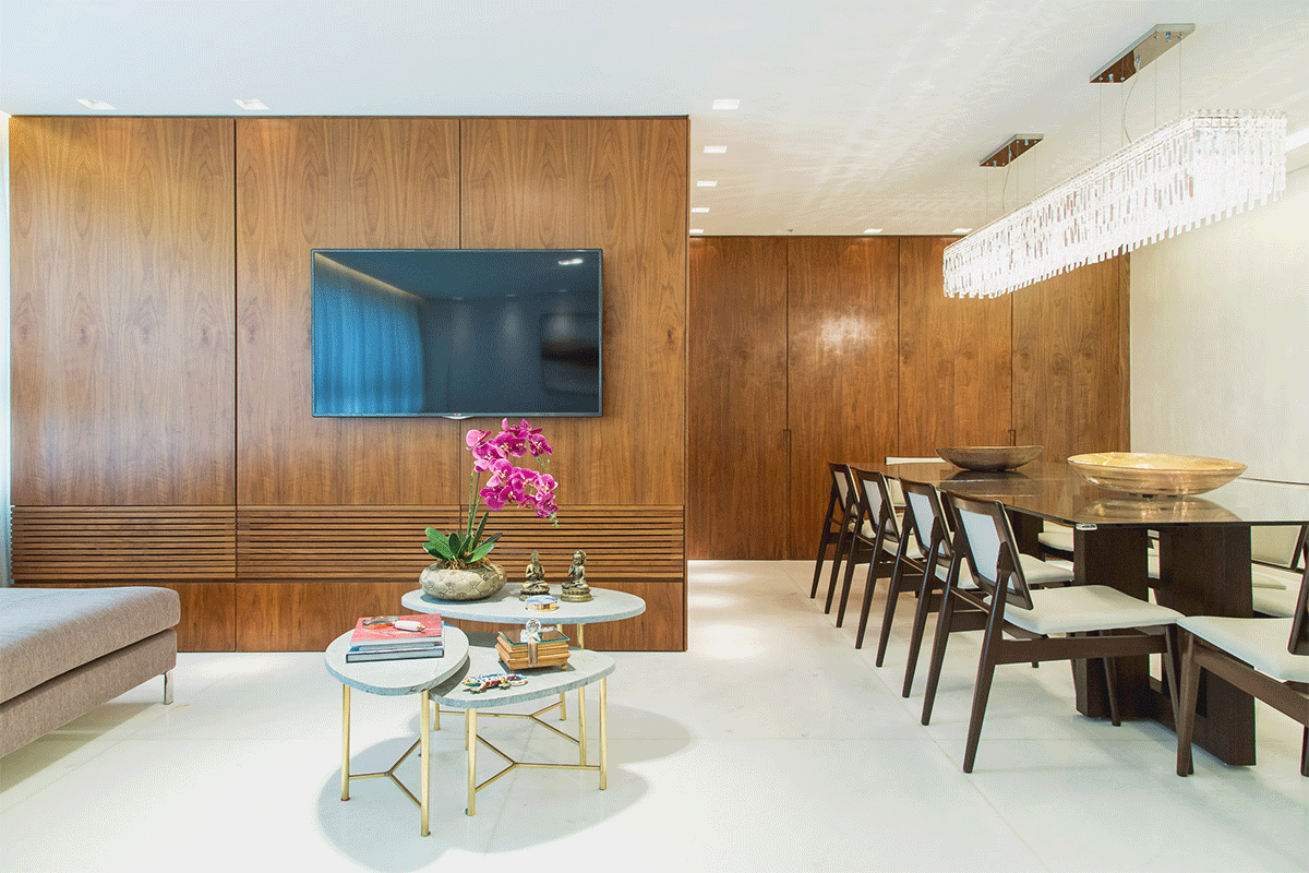 Quando foi convidada para executar esse projeto, a arquiteta Maria Fernanda Penido sugeriu para a família a criação de ambientes integrados, com o objetivo de destacar a área ampla do imóvel e gerar espaços conectados.