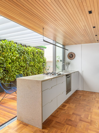 No terraço descoberto, foi projetado um pergolado em serralheria, espaçado para proporcionar privacidade sem bloquear a luz natural. Na parede oposta à cozinha, foi instalada uma parede verde. As paredes que separavam a antiga cozinha foram demolidas, criando um espaço aberto em forma de “L” entre a sala de estar e a cozinha. O lavabo foi integrado discretamente na marcenaria da cozinha, onde antes ficava o banheiro de serviço. Uma parede curva suaviza a transição entre os ambientes e oferece mais visões para a parede verde do terraço.