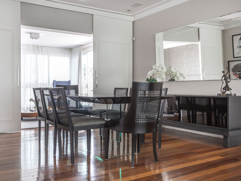A decoração reflete a personalidade dos moradores por meio da mescla de objetos clássicos e alegres. A sala de jantar, um dos ambientes preferidos da família, ganhou uma composição sóbria ao reutilizar mesas, cadeiras e um bufê que já pertenciam aos moradores.