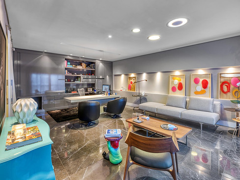 A paleta em tons neutros ganha pontos de cor nas obras de arte e peças de mobiliário, como a mesa azul de silestone na sala de reunião. Assim, o uso das cores de forma estratégica dá uma sensação mais descontraída e criativa ao espaço.